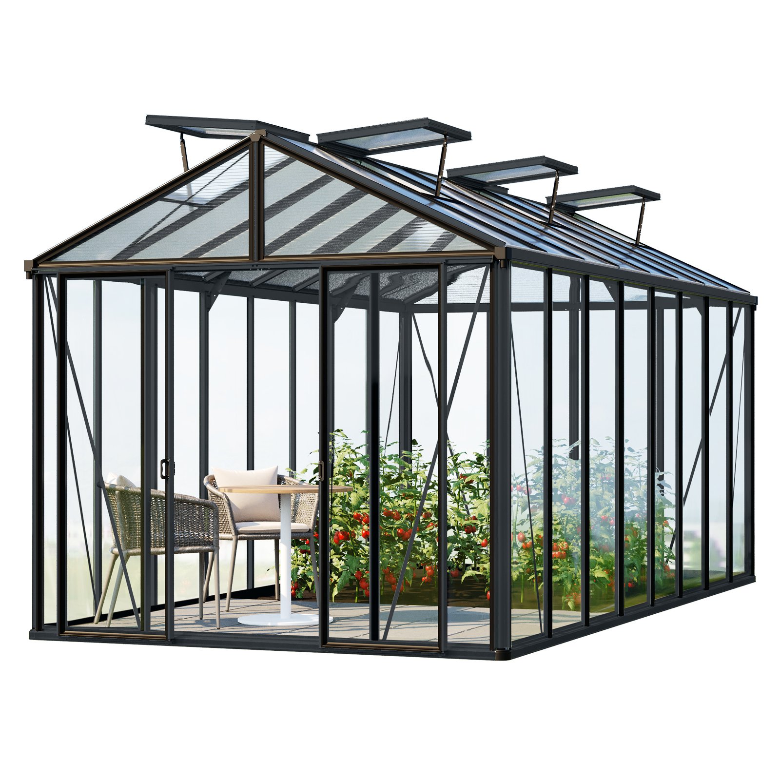 GFP Serre de jardin Hera 6 serre en verre 263x388 cm structure aluminium couleur anthracite avec ouvre-fenêtres auto. et table rabattable
