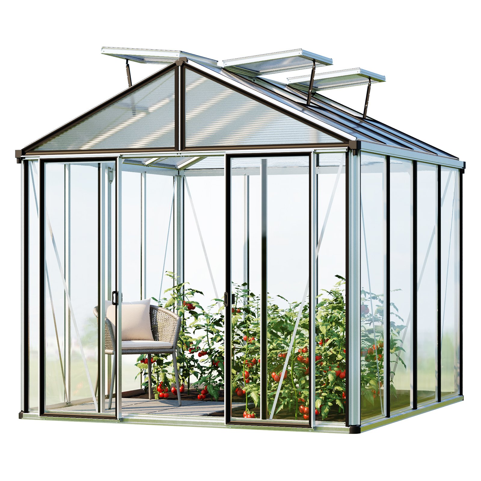 GFP Serre de jardin Hera 4 serre en verre 263x263 cm structure aluminium avec ouvre-fenêtres auto. et table rabattable
