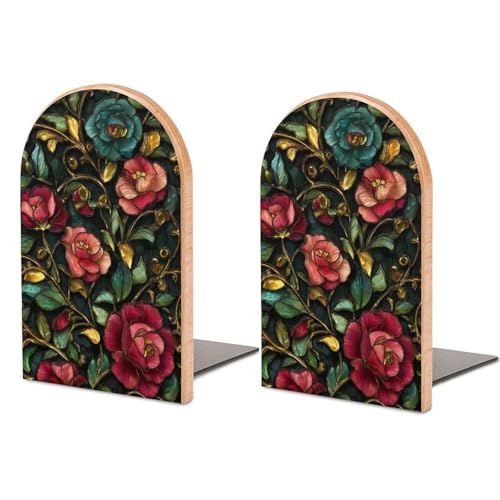 Lot de 2 serre-livres en bois avec roses en verre teinté - Style victorien - Pour la maison, le bureau, les bibliothèques