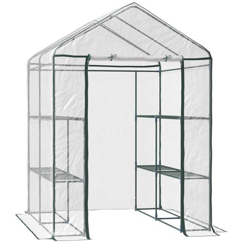 Outsunny Serre de Jardin PE avec étagères 2 Niveaux, Serre de Balcon, bâche renforcée 140 g/m², châssis en Acier, Porte zippée Enroulable, pour légumes Plantes Fleurs, 143x143x195cm, Blanc