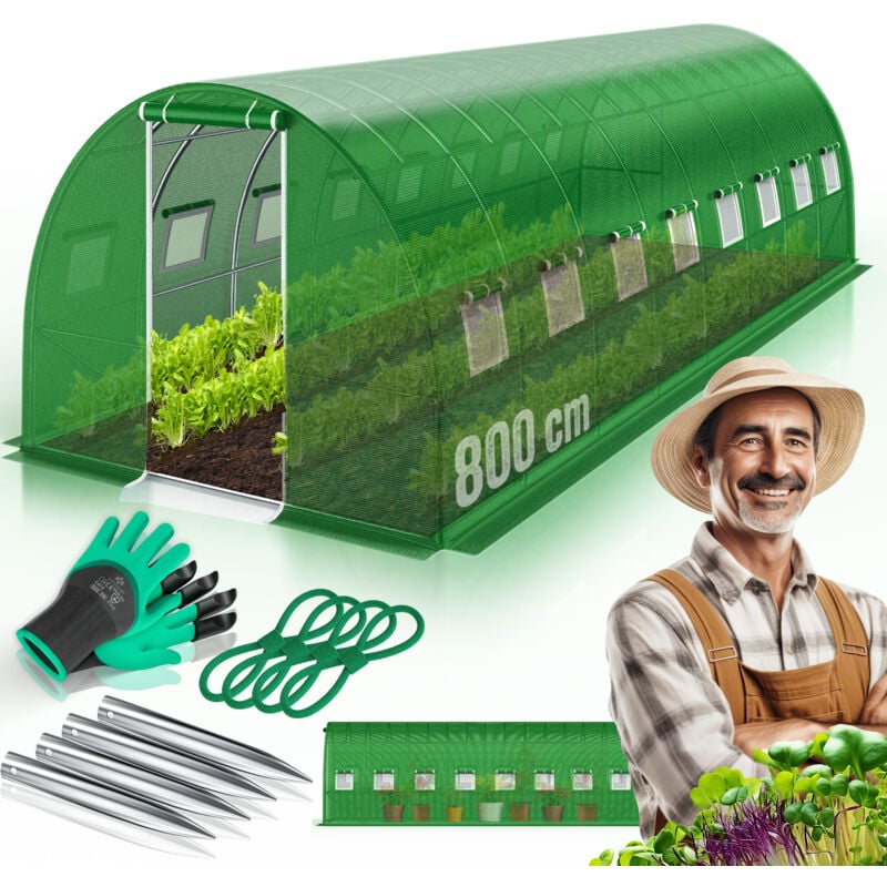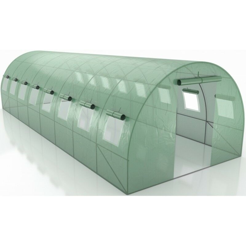 Serre tunnel de jardin 24m² avec 16 fenêtres, bâche PE verte et porte zippée en acier galvanisé - 8x3x2m