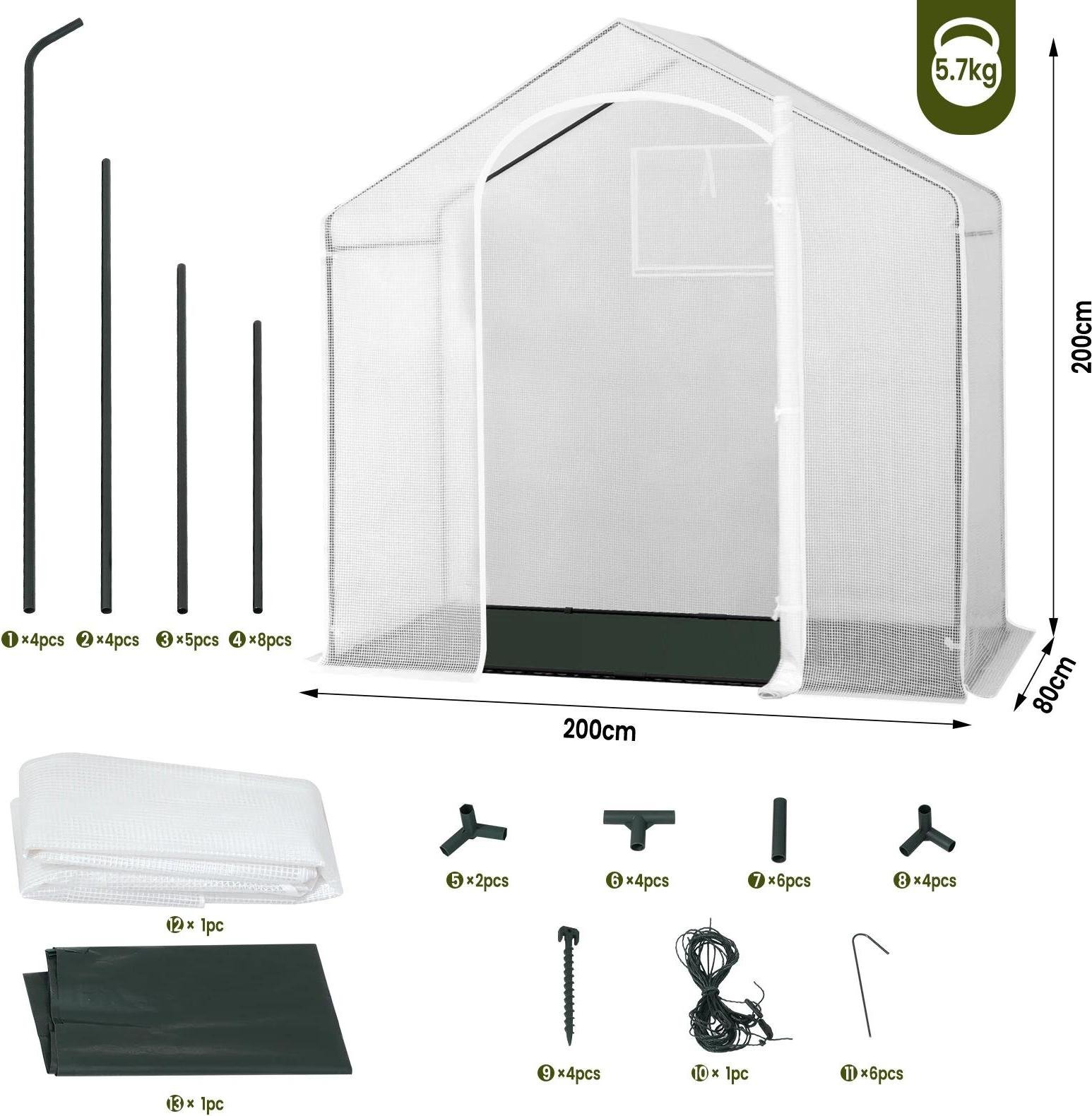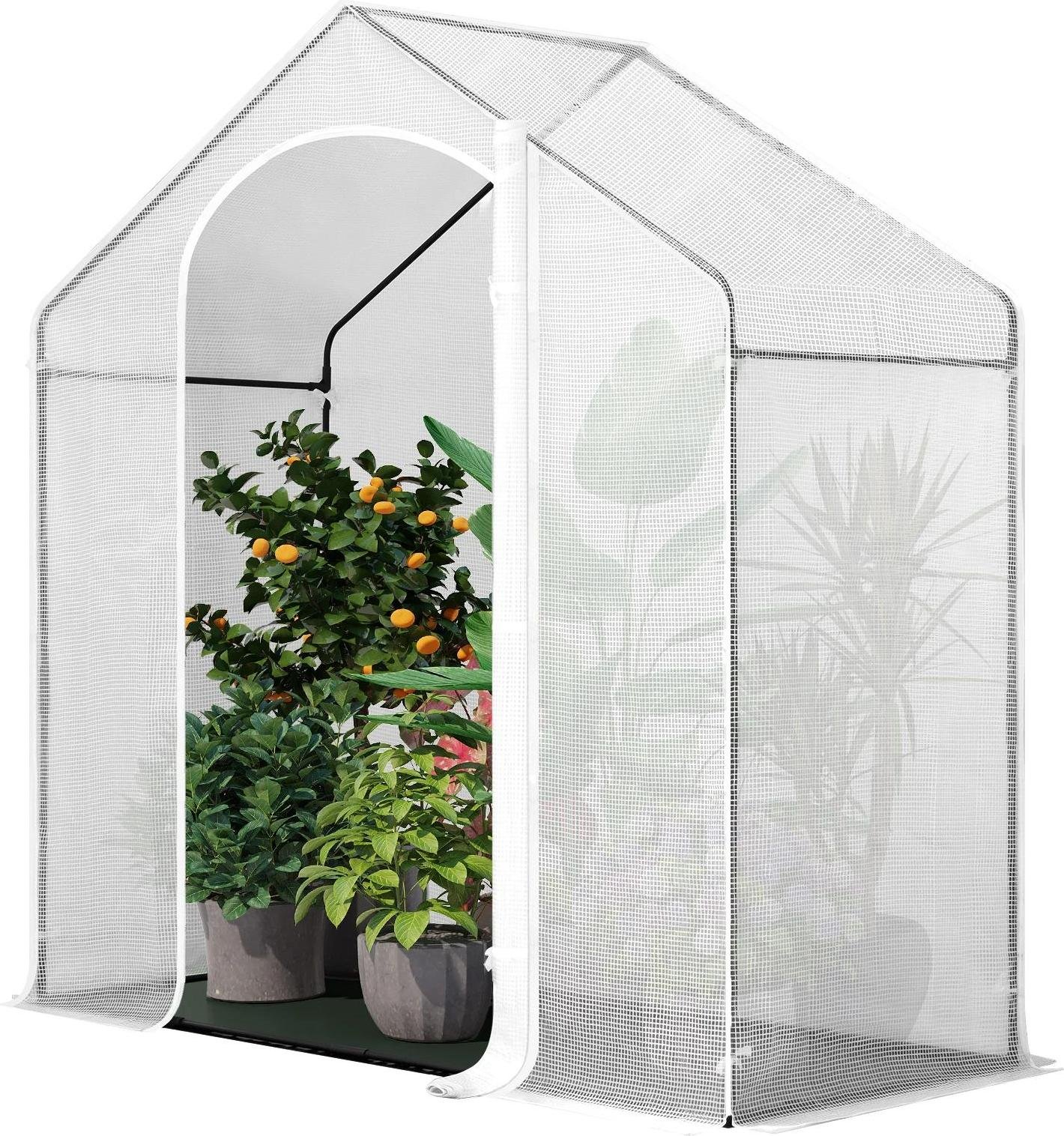 Serre tunnel en plastique - à une nef - 200×80×200 cm - Avec porte - 2 fenêtres - Tente d'hiver pour tomates & légumes - Blanc