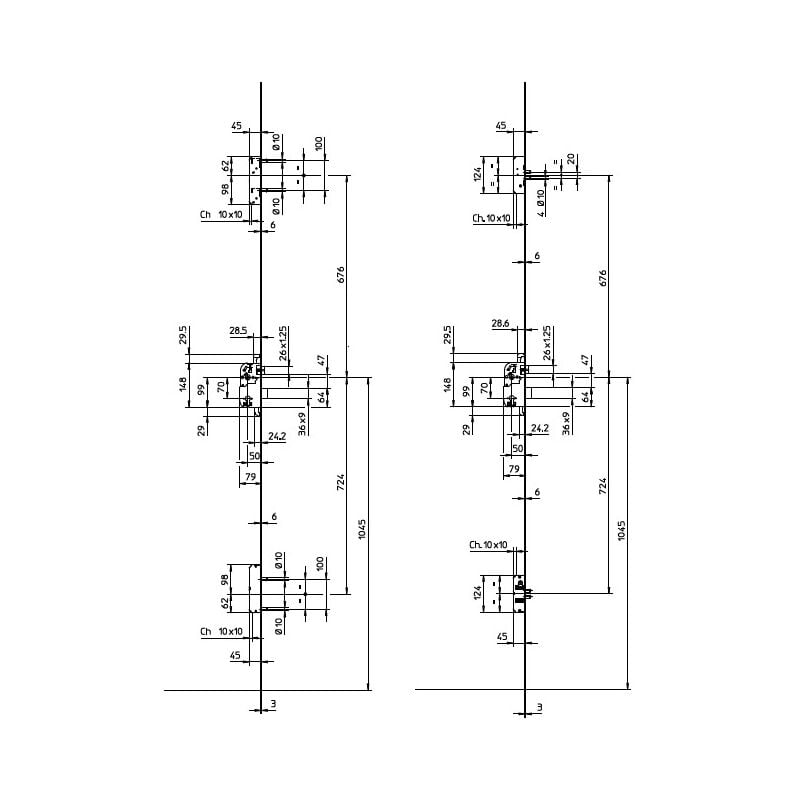 Serrure à larder 3 points axe 24 mm - Tétière 24 mm filante inox en U - Pêne dormant et demi-tour - U7