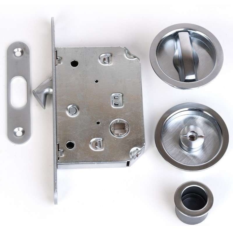 Serrure porte coulissante à crochet - Axe 50mm - Rosaces rondes condamnation + tire-doigts + gache Secury-t