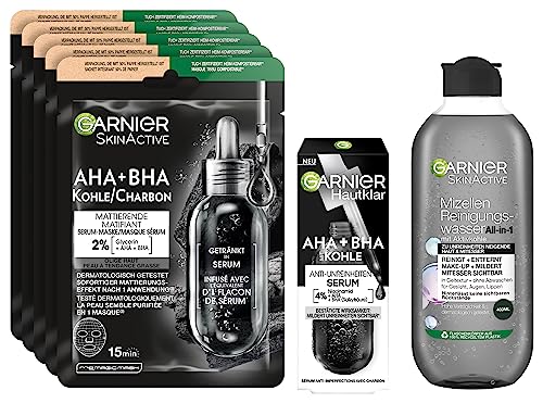 Garnier SkinActive Black Skin Routine Kit de soin du visage avec 5 masques noirs, tonique micellaire et sérum AHA BHA pour un teint plus uniforme sur les peaux normales ou à imperfections