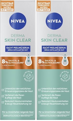 NIVEA Derma Skin Clear Sérum exfoliant de nuit pour un teint visiblement amélioré, sérum exfoliant à la niacinamide qui affine les pores avec AHA et BHA (40 ml) (Lot de 2)
