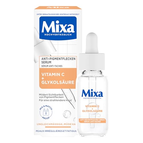 Mixa Sérum anti-taches pigmentaires pour peaux irrégulières, ternes et sensibles avec vitamine C et niacinamide, convient pour le visage et le cou, SPF 20, hypoallergénique, 30 ml