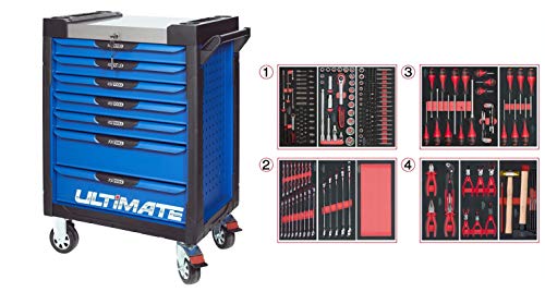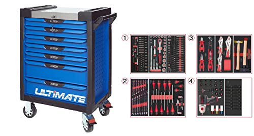 KS Tools 804.7241 - Servante d'atelier 7 tiroirs - Gamme ULTIMATE® - Système de fermeture centralisé par serrure - 4 roues robustes - Equipée de 241 outils - Couleur Bleue