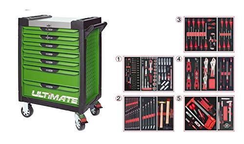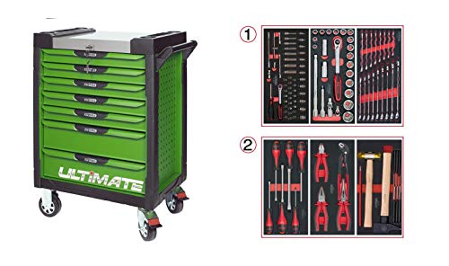KS Tools 817.7173 - Servante d'atelier 7 tiroirs - Gamme ULTIMATE® - Système de fermeture centralisé par serrure - 4 roues robustes - Equipée de 173 outils - Couleur Verte