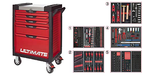 KS Tools 809.5311 - Servante d'atelier 5 tiroirs - Gamme ULTIMATE® - Système de fermeture centralisé par serrure - 4 roues robustes - Equipée de 311 outils - Couleur Rouge