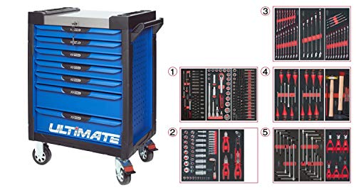 KS Tools 804.7311 - Servante d'atelier 7 tiroirs - Gamme ULTIMATE® - Système de fermeture centralisé par serrure - 4 roues robustes - Equipée de 311 outils - Couleur Bleue