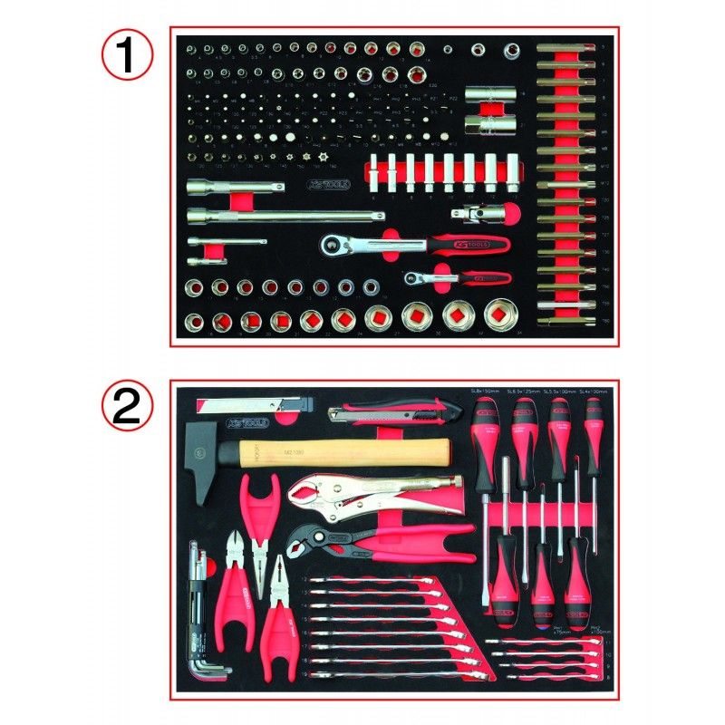 KS Tools 714.0114 - Composition d'outils 2 tiroirs pour servante - Empreinte des outils découpée au laser - Résistant aux huiles et produits chimiques - Mousse imputrescible - 114 pièces