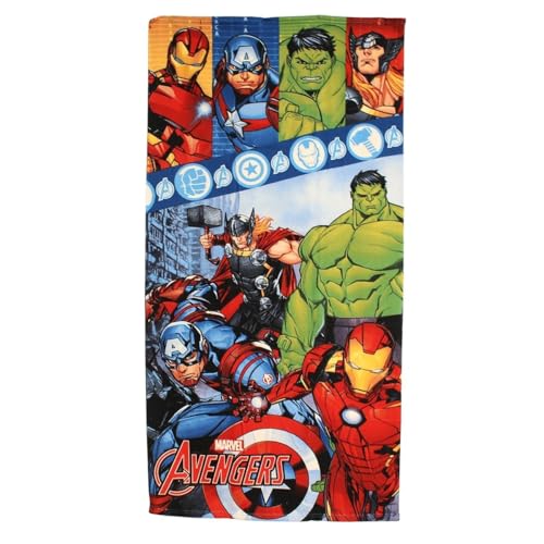 Character World Serviette Officielle Disney Marvel Avengers | Toucher Super Doux, Motif Badge | Parfait pour la Maison, Le Bain, la Plage et la Piscine | Taille Unique 140 cm x 70 cm