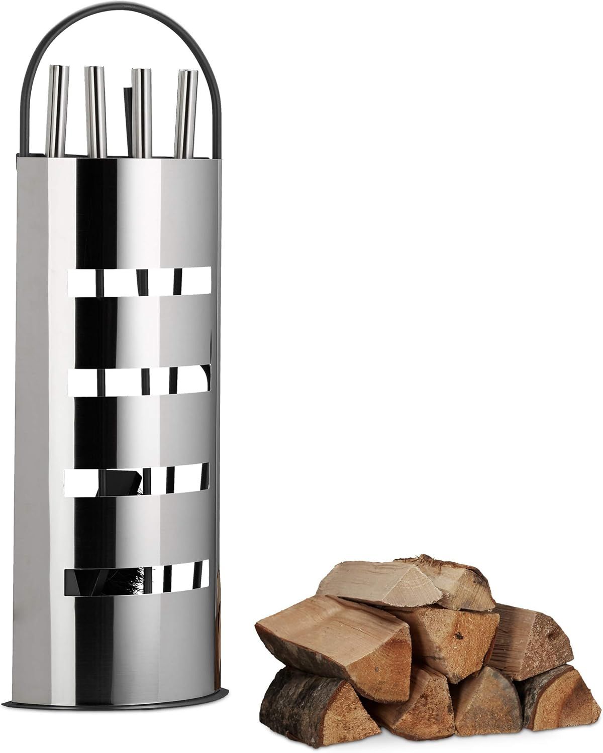 Relaxdays Serviteur de cheminée, Moderne, 5 pièces : tisonnier, Pelle à Cendres, Balai, Pince et Support, Gris/argenté