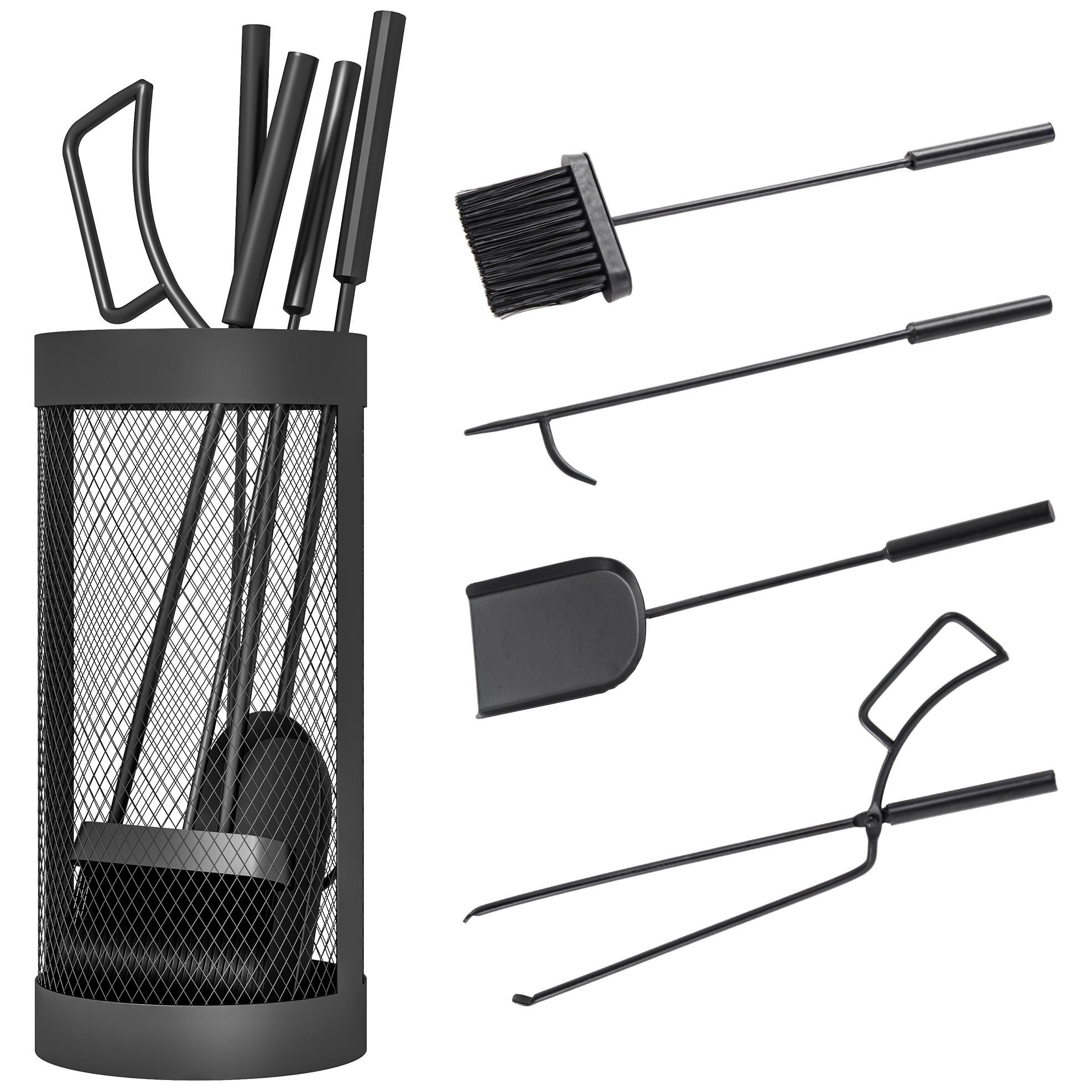 Relaxdays Serviteur de cheminée, Moderne, 5 pièces : tisonnier, Pelle à Cendres, Balai, Pince et Support, Noir