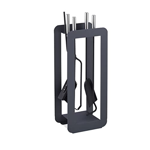 Relaxdays Serviteur de cheminée, Moderne, 5 pièces : tisonnier, Pelle à Cendres, Balai, Pince et Support, Gris/Noir