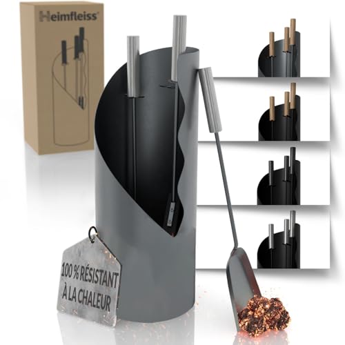 Heimfleiss® Serviteur Cheminée Gris Moderne | Ensemble d'Accessoires de Cheminée | Kit Cheminée avec Tisonnier, Pelle & Balayette | Accessoires de Cheminée avec Manches en Bois
