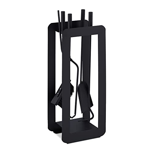 Relaxdays 10022291 Ensemble serviteur de cheminée 5 pièces Support Pelle Balai Pince Crochet Acier Moderne, Noir, 66 x 23 x 15 cm