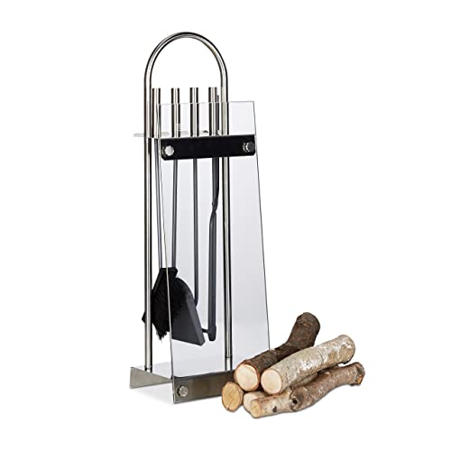 Relaxdays Ensemble serviteur de cheminée 5 pièces pelle balai pince tisonnier acier verre inox moderne, argenté