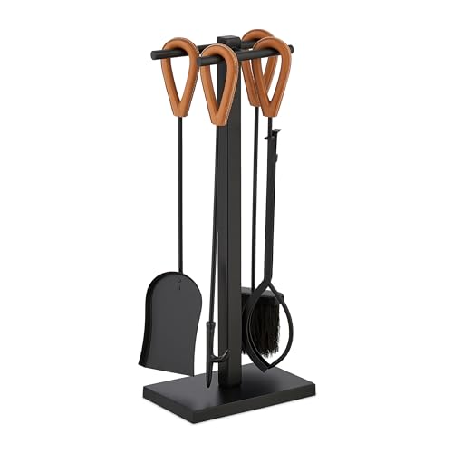 Relaxdays Serviteur pour cheminée, lot 5 pièces, tisonnier, Pelle, Balai à Cendres, Pince, Support, Cuir, Noir - Marron