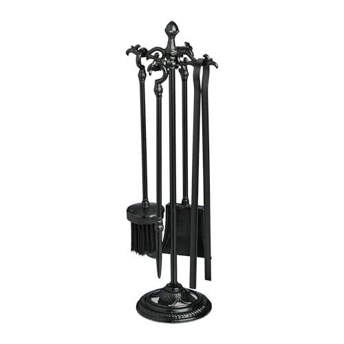 Relaxdays Serviteur pour cheminée, 5 pièces, tisonnier, Pelle, Balai, Pince & Support, pour poêle, Fonte, Noir