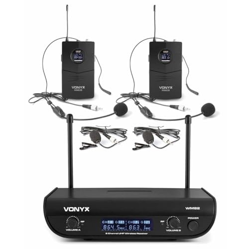 Vonyx WM82 Set de 2 Microphones sans Fil - 2 Canaux, Système UHF 2, Fréquence Fixe, Porté 50m, Double Récepteur, Réglage Volume Indépendant, Valise Transport Fournie