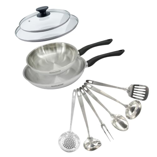 Fackelmann 9440250 Set poêles 20 et 24 cm en inox 18/8, Couvercle verre et 6 ustensiles inox, Poêle tous feux, Poêle induction, Poêle sans PFAS, Manche riveté, Inox, Verre, 20 et 24 cm