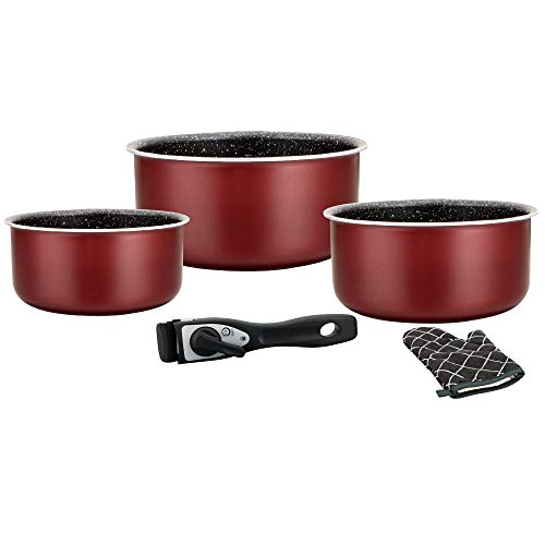 Herzberg - Batterie de cuisine - Set de casseroles induction 5 pièces - Casseroles et poêle tous feux en aluminium forgé avec revêtement marbre et poignée amovible - Bordeaux