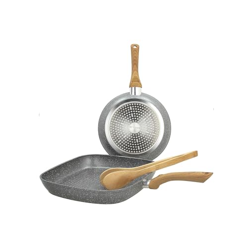 Set Poêle ronde antiadhésive avec gril carré et pinces – Set poêle, grill à induction et pinces, avec revêtement Marmotech et pinces en bambou, poêle de 24 cm et grill de 28 cm