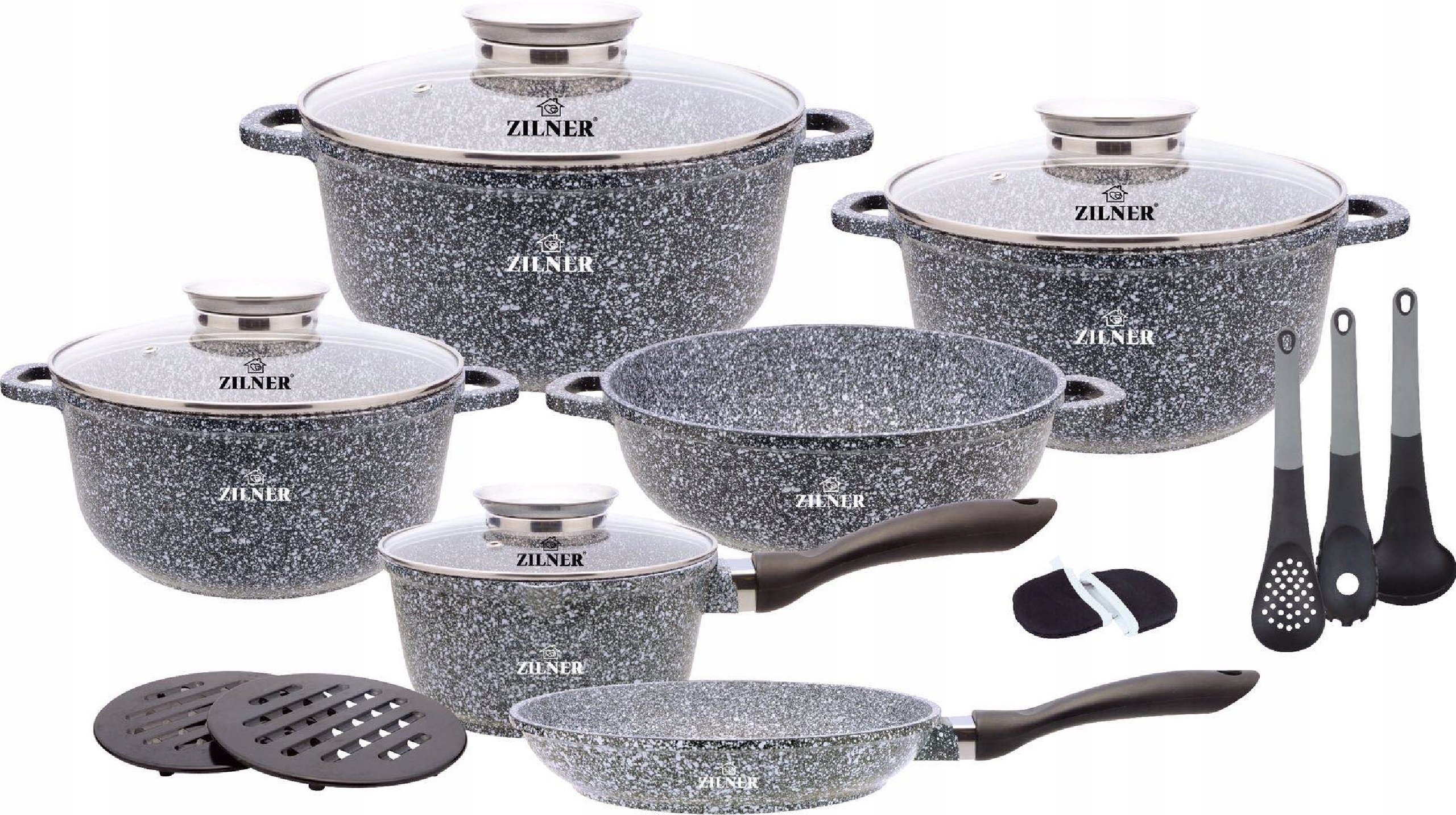 Zilner Belle casserole grise avec revêtement en marbre 17 éléments couvercle en verre, Casseroles et poêles revêtues, Set de casseroles à induction | Set de casseroles à induction ZL7060