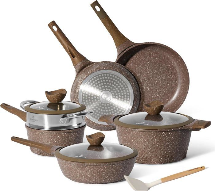 Batterie de cuisine - BOREINE - Casserole et poele - Tous feux donc induction - Poignée amovible - Antiadhésif - Marron 14 Pce