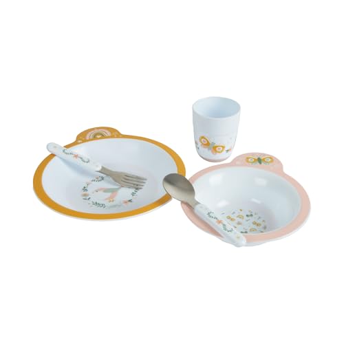 BEBE DOUCEUR, Set Repas 5 Pièces avec Assiette + Bol + Gobelet + Couverts Inox Fantasy Garden