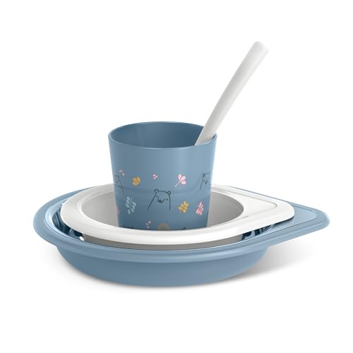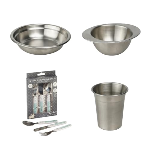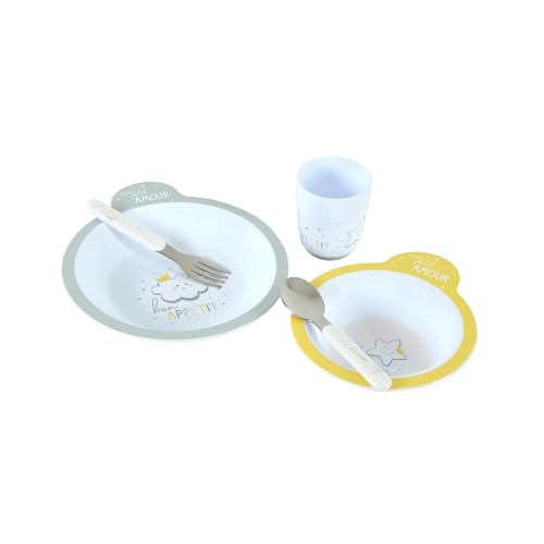 Bébé Douceur, Set Repas 5 Pieces avec Assiette + Bol + Gobelet + Couverts Inox Essen'Ciel