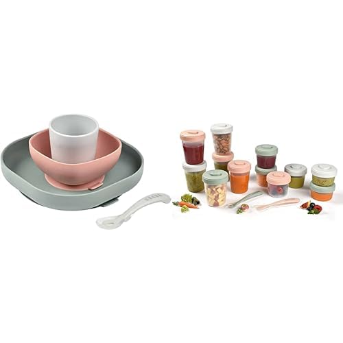 BÉABA, Set Vaisselle Silicone Repas Bébé, Avec Ventouse, Anti-dérapant, 4 Pièces, Assiette + Bol+ Verre + Cuillère & Lot de 12 Portions Conservation et 2 Cuillères Silicone, Clip, Pots empilables