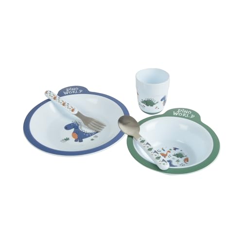 BEBE DOUCEUR, Set Repas 5 Pièces avec Assiette + Bol + Gobelet + Couverts Inox Dino World
