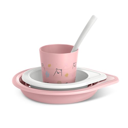 Suavinex, Vaisselle Apprentissage Bébe +6 Mois, Set Assiettes, Set Vaisselle Enfants, Coffret Repas Bébé Apte Lave-vaisselle et Micro-ondes. Inclut : Verre + Assiete Plate + Bol + Cuillère, Bears Rose