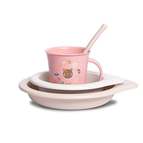 Suavinex, Set Repas Bébé, Set Vaisselle pour Enfant avec : Assiette Plate + Bol + Tasse + Cuillère. 4 Pièces. À partir 6 Mois. Compatible lave-vaisselle, Micro-onde. Forêt Rose