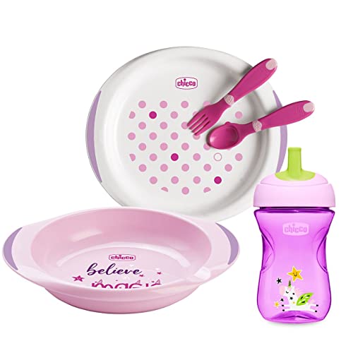 Chicco Coffret Repas 12M+, contient 1 tasse, 2 assiettes et couverts, fourchette et cuillère, set de sevrage pour bébé, Rose aléatoire