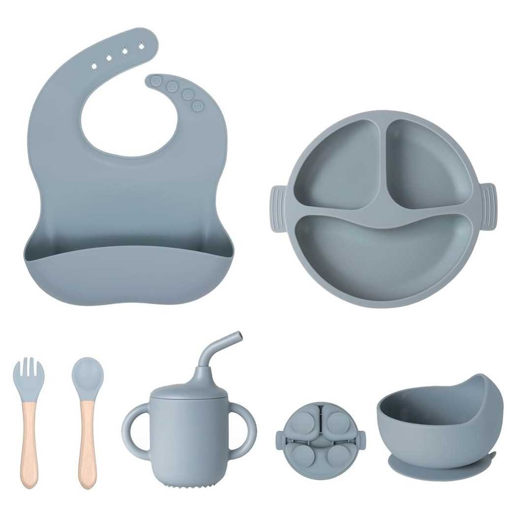 Brunoko Assiette ventouse pour bébé set de repas 5-en-1 Assiette ventouse + cuillère + bavoir en silicone + gobelet réutilisable pour bébé + pailles en silicone - Silicone sans BPA.