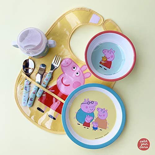 PETIT JOUR - Set Repas Pour Bébé +6 Mois - Mélamine - Sans BPA - Assiette Bébé 18cm, Bol 250ml, Tasse 2 Anses 160ml, Set De Couverts, Bavoir Toile Cirée - Peppa Pig