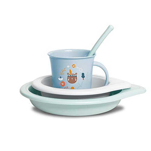 Suavinex, Set Repas Bébé, Set Vaisselle pour Enfant avec : Assiette Plate + Bol + Tasse + Cuillère. 4 Pièces. À partir 6 Mois. Compatible lave-vaisselle, Micro-onde. Forêt Bleu