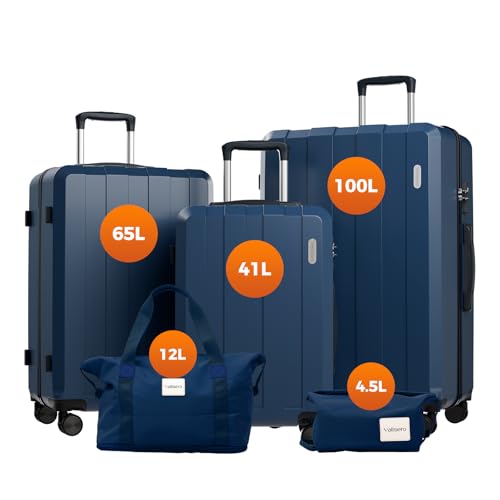 Vallsero Set de Valises, Sets de Bagages, Valise Set de 5 Pièces Grand Espace avec roulettes 360°, Poignée Télescopique, Inclut 1 Trousse de Toilette et 1 Sac, Serrure TSA (Bleu foncé)
