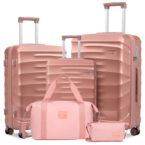Vallsero Set de Valises, Sets de Bagages, Valise Set de 5 Pièces Grand Espace avec roulettes 360°, Poignée Télescopique, Inclut 1 Trousse de Toilette et 1 Sac, Serrure TSA(Rose Gold)