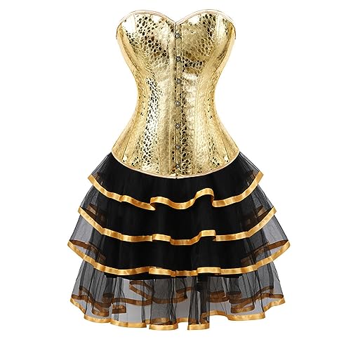 Top Corset Bustier pour Femme - Robe Corset en Cuir PU Doré Corset Sexy Steampunk À Lacets avec Jupe Tutu Ensembles Costume Cosplay Gothique Taille Plus,Or,XL