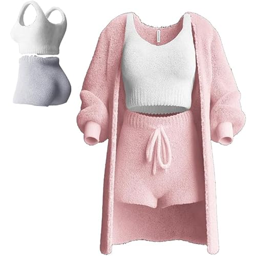 YoiTs Misscosy Ensemble en Tricot 3 pièces, Pyjama Sexy en Polaire Chaude et pelucheuse, Ensemble Haut et Short, vêtements de détente (Pink,Medium)