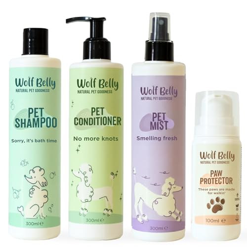 Wolf Belly - Pack Hygiène et Soin Complet pour Chiens et Chats | Shampoing + Après shampoing + Brume + Baume Coussinets | Aloe Vera 99%, Végan et Hypoallergénique - Fabriqué en UE