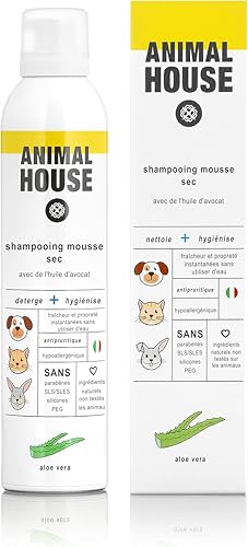 Animal House Shampoing Mousse Sèche 300ml pour Chiens Made in Italy Hypoallergénique, pour Tous Les Poils, avec des huiles essentielles d'amande ou d'avocat (Aloe Vera)