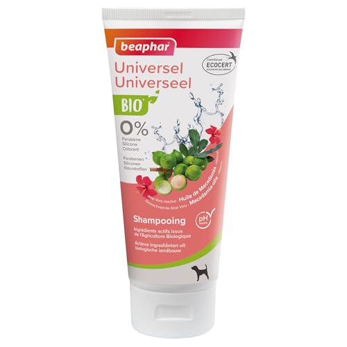 BEAPHAR – Shampoing Universel labellisé ECOCERT pour Tous Les pelages du Chien – Contient de l'Aloe Vera, de l'huile de Macadamia et des Fleurs d'hibiscus Bio – pH Neutre – 0% parabène – 200 ML