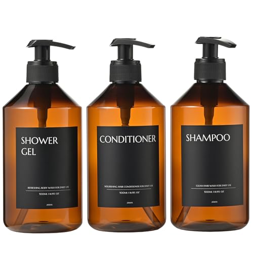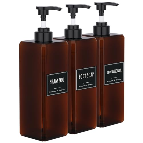 Bouteille de shampoing Rechargeable de 500 ML, Segbeauty Distributeur de shampoing 3 pièces 16,9 oz avec étiquette, Bouteilles à Pompe vides, Distributeur de Presse en Plastique Marron