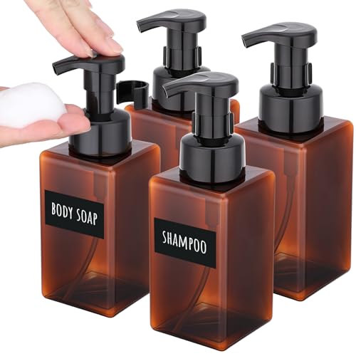 Segbeauty Flacon Mousseur Vide, 4 Pièces 450ml Distributeur Savon Liquide, Distributeur Shampoing et Gel Douche, en Plastique, Bouteille Shampoing avec Etiquettes (Marron)